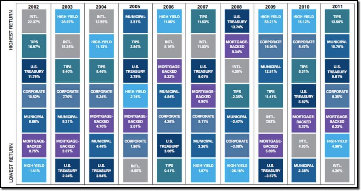 Another way to see the lack of correlation among Munis and other types of bonds is to look at Exhibit 3, which ranks the best performing bond asset classes each year from 2002-2011. The ranking of the returns from the various types of bonds varies greatly each year.